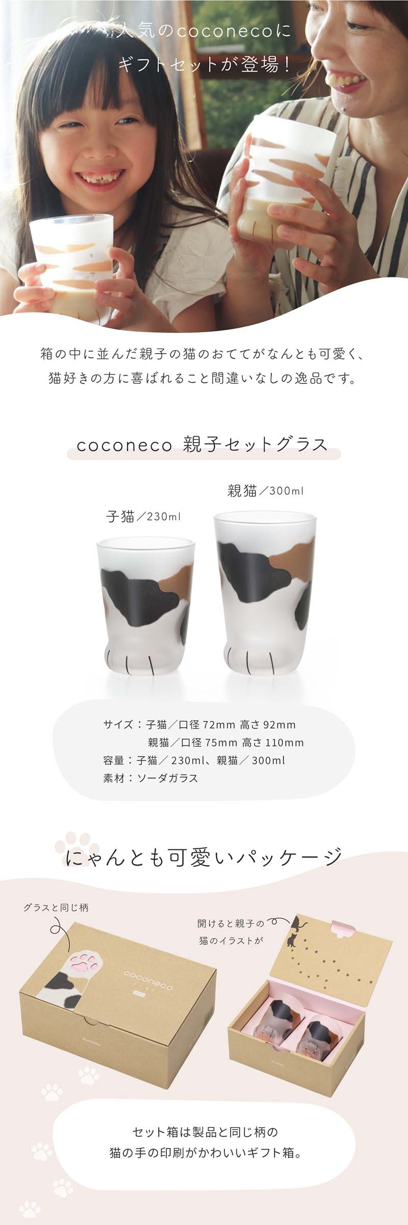 Perfect for cat lovers, this Coconeco cat paw glass gift set features an adorable brown tabby design. The set includes one adult-sized tumbler (300ml) and one kitten-sized tumbler (230ml), each thoughtfully crafted by Japanese artisans with intricate details.