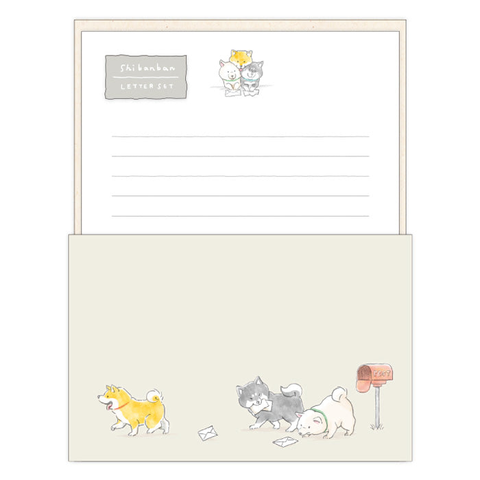 These kawaii letter writing sets are part of the "Shibanban" character series from Mind Wave - this particular design is named "Delivery" and features cute Shiba Inu dogs playing with the mail.
