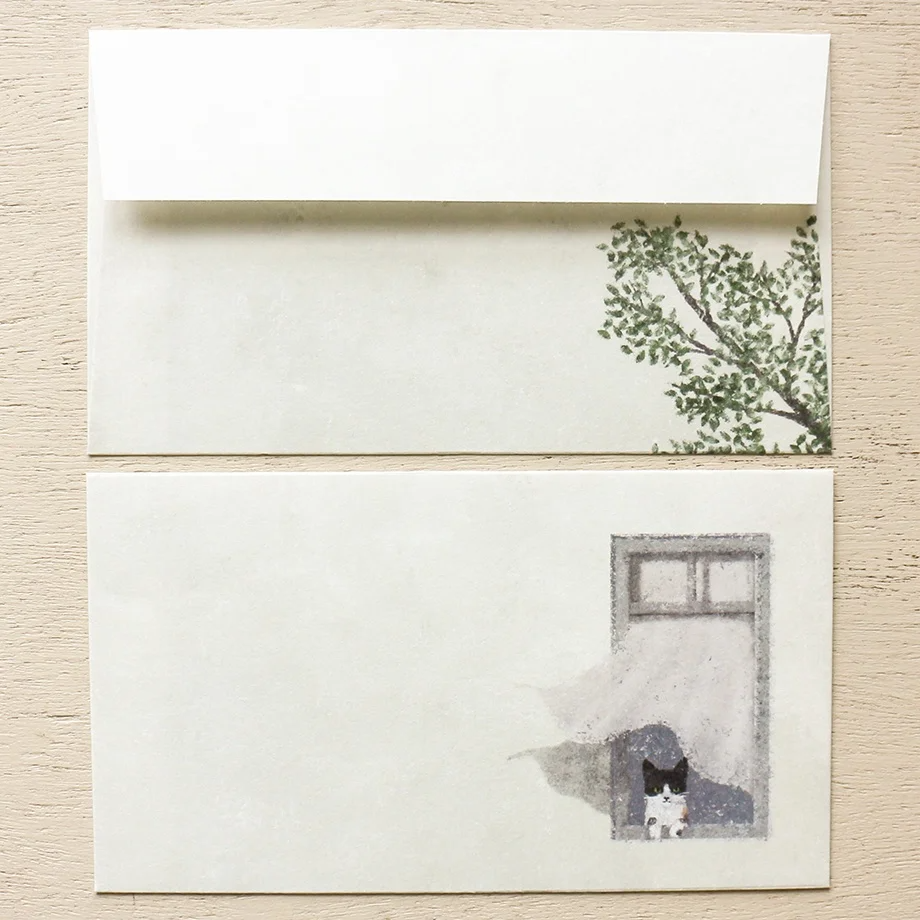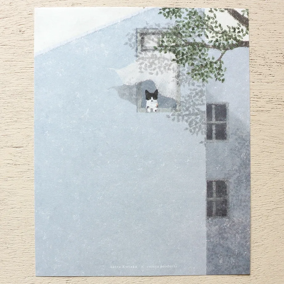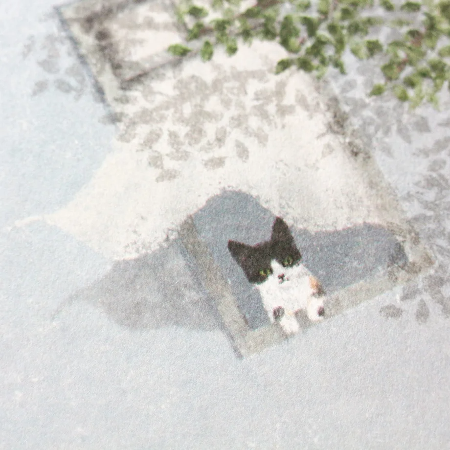 Titled おしえてあげる (Oshiete Ageru) - meaning "I'll tell you" this charming set features an intriguing illustration of a cat peeking out from a window, its expression full of meaning, as if about to share a secret. Also captured is the gentle breeze flowing through the tree and into the window.