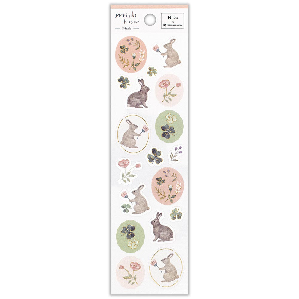 Titled "Petal" this sticker pack features the designs of Japanese artist Michikusa, where delicate pink florals, clover leaves and adorably illustrated rabbits combine to form round and square shape stickers with a perforated stamp-style border.