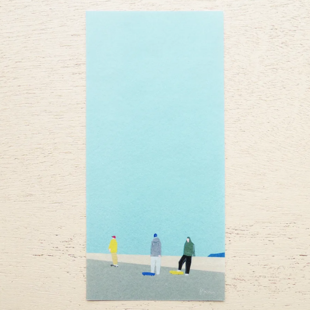 Each tall, narrow sheet showcases Bannai’s signature minimalist artwork, where clean shapes and subtle colours showcase peaceful coastal views, and quiet urban moments, evoking the feeling of a seaside trip. The vertical layout gives these illustrations room to breathe while creating a natural flow down the page.