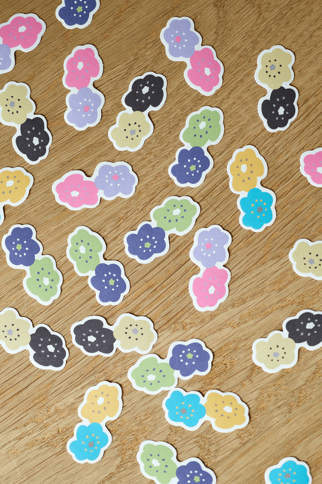 Add a floral decorative touch to your creative projects with these pretty flake stickers, featuring the iconic "smile" flower print from Kyoto design house SOU.SOU. These small peelable stickers are great for use in a wide variety of creative applications - add a splash of colour to your diaries and journals or use to decorate a gift for someone special!