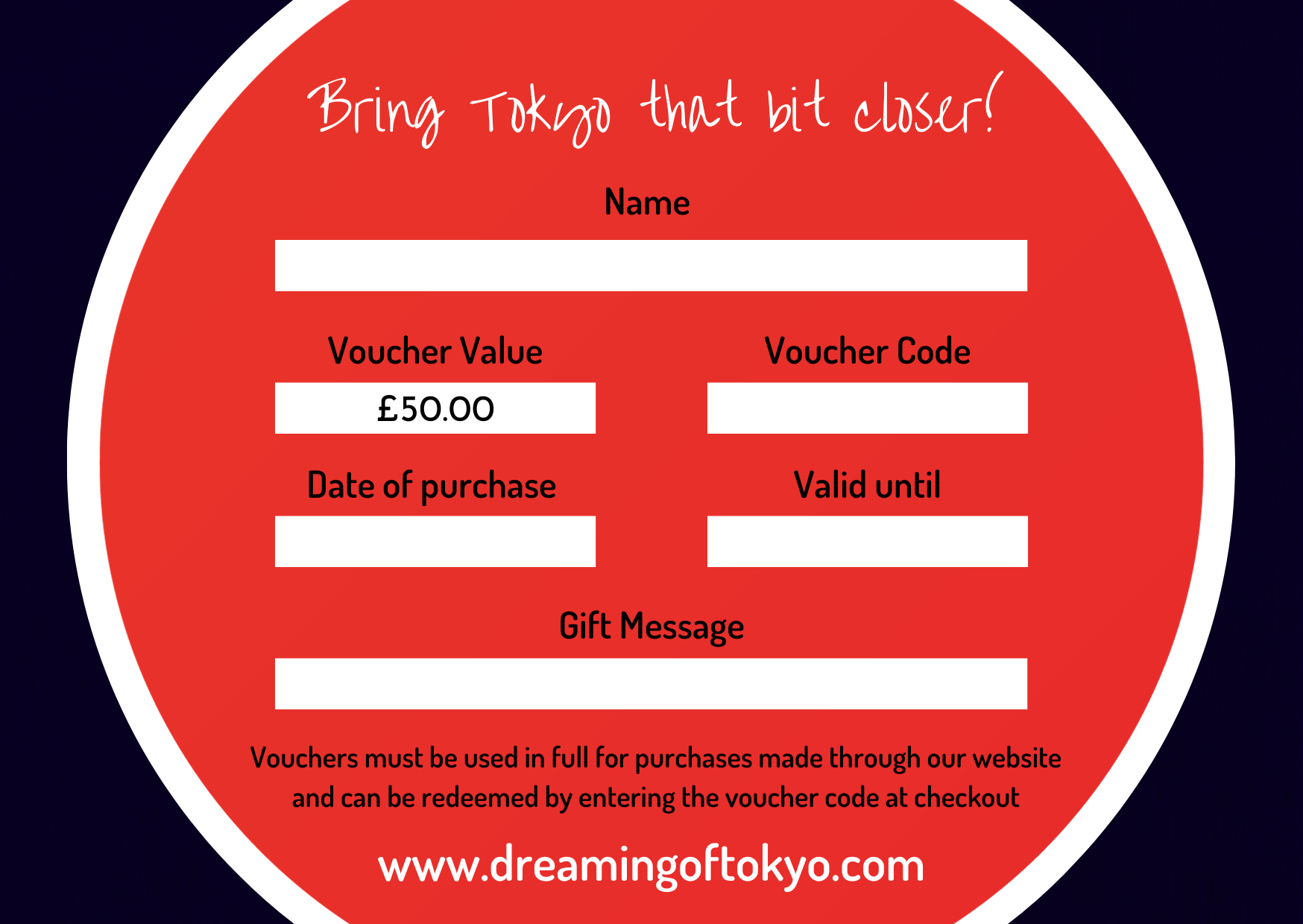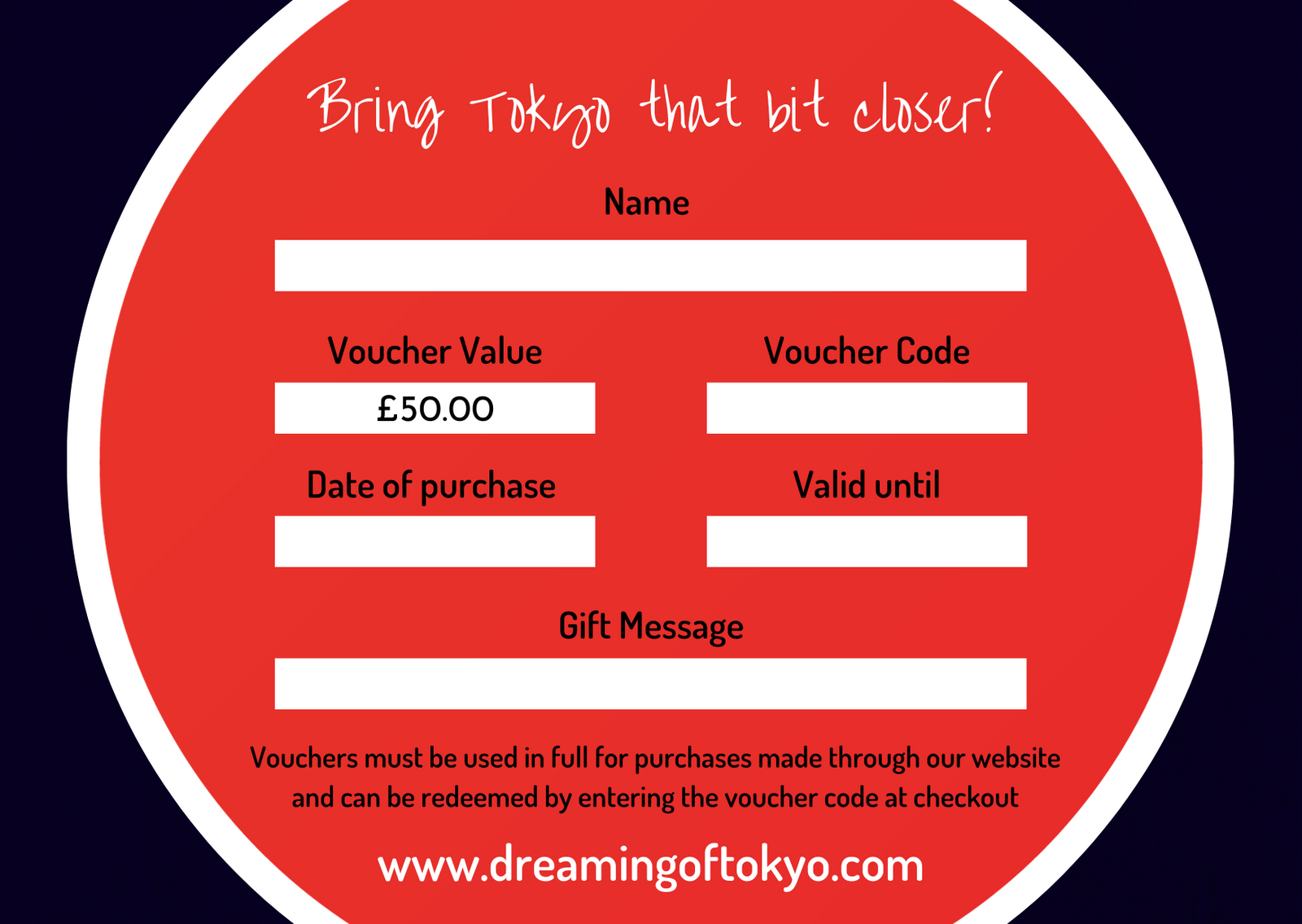 Our vouchers can be used on all products in our website store (www.dreamingoftokyo.com) and are easy to redeem by simply entering the unique voucher code at checkout.